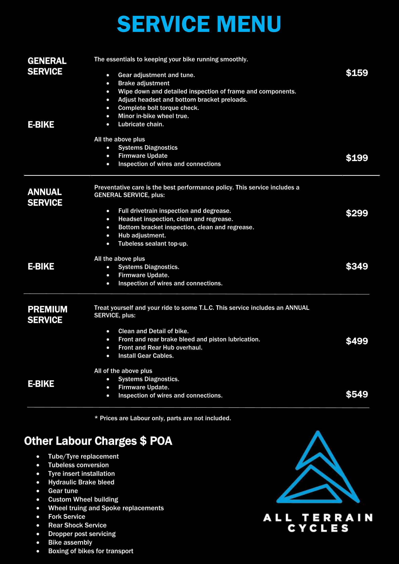 All Terrain Cycles will incur workshop labour and freight fees***.